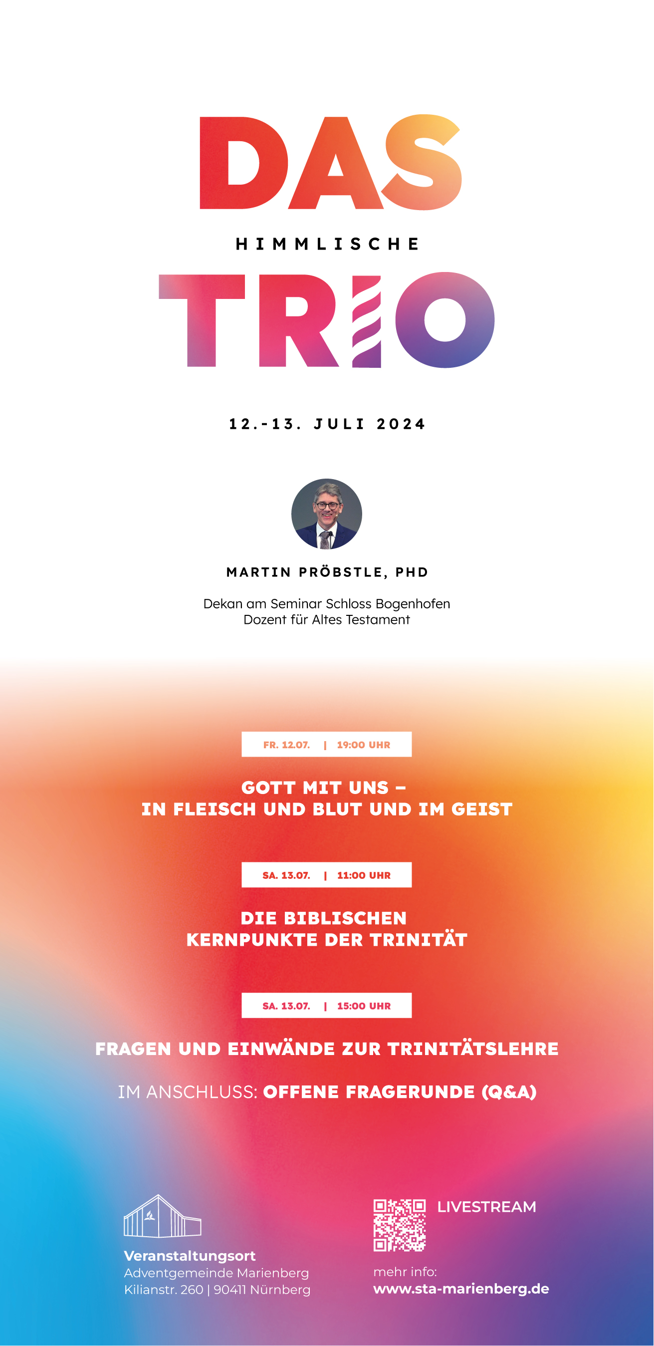 Wir laden Dich herzlich ein, am 12. und 13. Juli an unserer Veranstaltung teilzunehmen. Wir haben einen Spezialisten auf diesem Gebiet eingeladen, der die biblische Sicht zur Trinitätslehre aus einer neuen Perspektive beleuchtet. Zudem wird er auf die gängigen Einwände gegen die Trinität eingehen, sowohl aus der Bibel als auch aus der Kirchen- und Adventgeschichte.